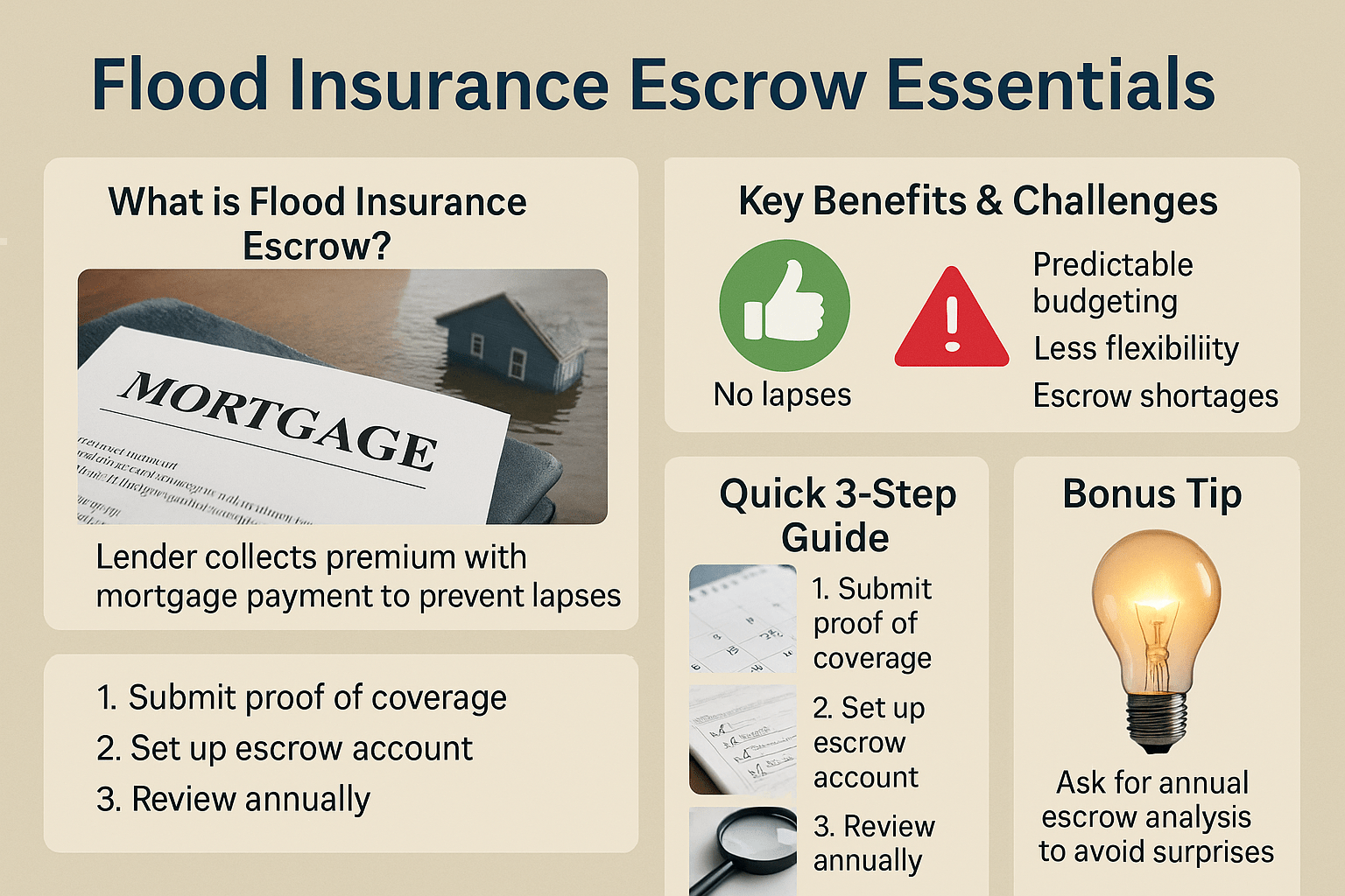 🔹 Pro Tip: Get ahead of the game. If you’re shopping for a home in a flood zone, ask the lender upfront if they require escrow. Don’t wait until closing day to find out!