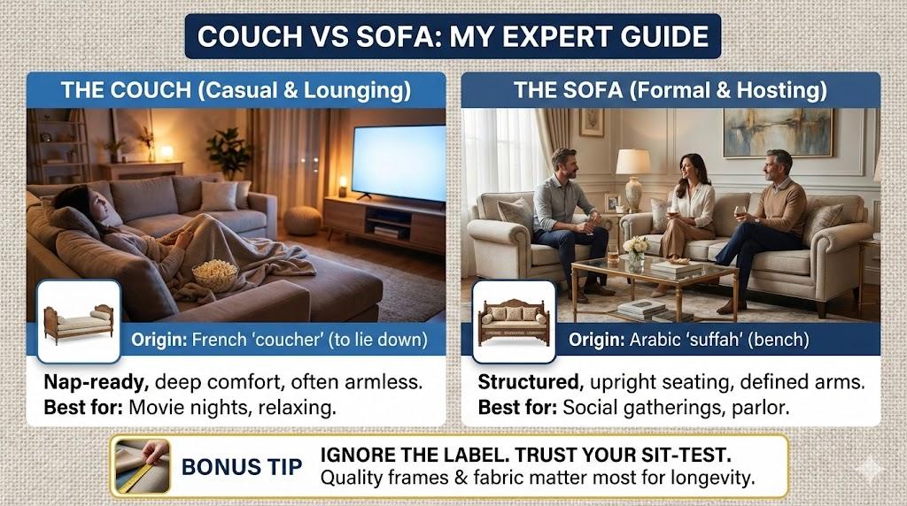 If there is one thing I want you to take away from my journey, it is that the label matters less than the feeling. I have owned “sofas” that felt like clouds and “couches” that felt like park benches. My best advice is to ignore the salesperson and trust your own sit-test.