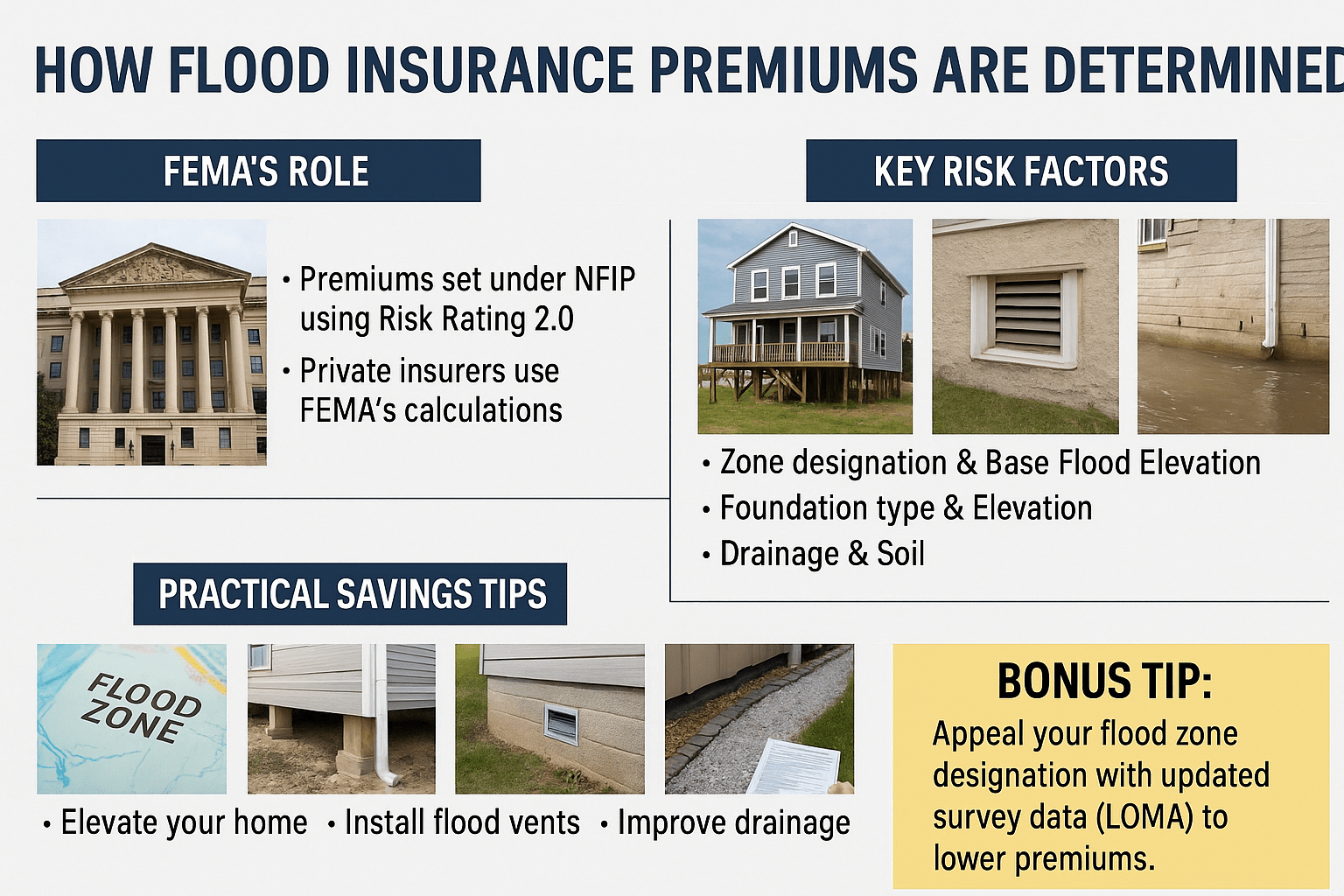 - What FEMA controls (flood zone maps, base rates).
