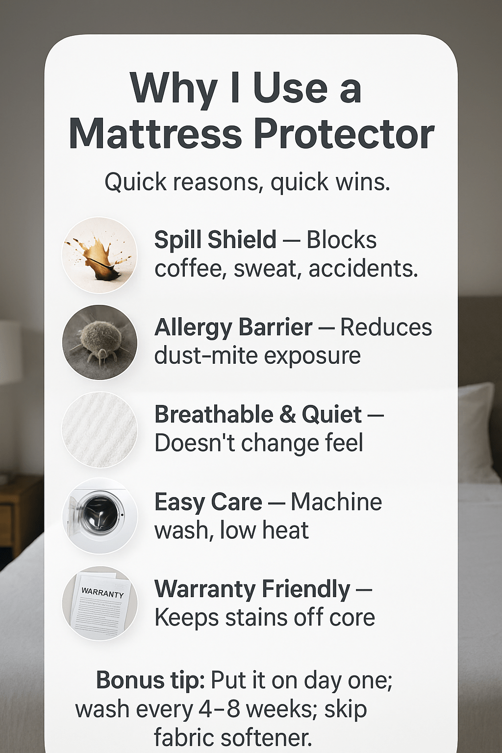 I kept waking stuffy in spring. An allergist reminded me dust mites love mattresses. A protector became my low-lift barrier: wash it, dry it, re-fit it, and I’m not laundering the whole bed or wrestling a heavy cover weekly.