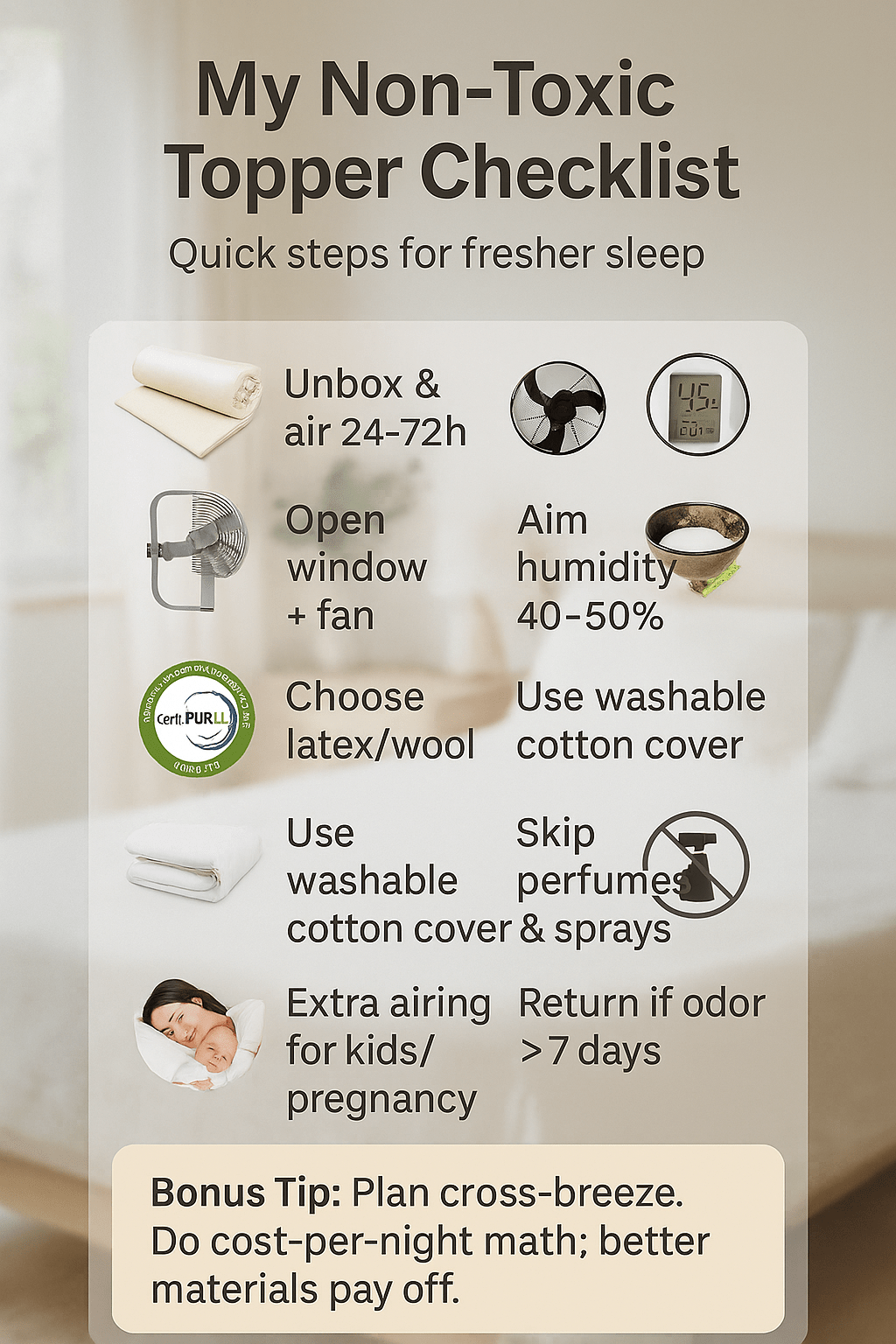 Material first, certification second, ventilation always. Wash the cover, air the topper, and keep the room dry and breezy. If a product still bothers me after a week, I return it—no drama. For kids, pregnancy, and pets, I default to low-odor picks and longer airing times.