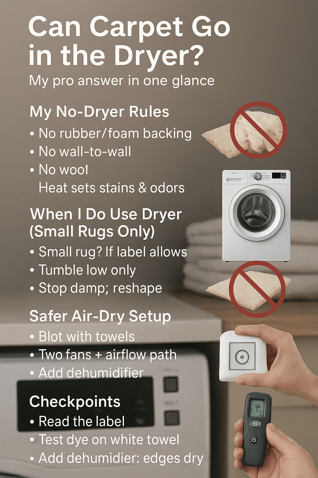 A dryer is a terrific tool—for clothes. For most carpets and many rugs, it’s a heat hammer in a layered world. I protect the layers, move air like a pro, and verify dry with numbers, not guesses. That’s how I save beauty, structure, and money in real homes.