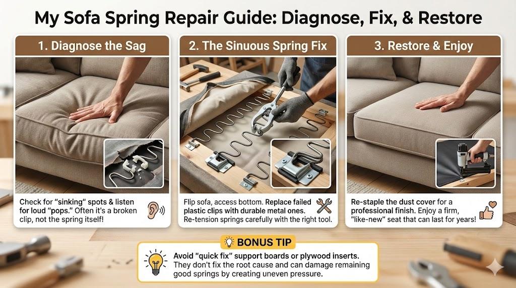 I also avoid “quick fix” kits from the internet that involve just jamming a piece of wood under the springs. It might feel firm for a week, but it eventually ruins the remaining good springs by creating uneven pressure points. I prefer doing it the right way, even if it takes more effort and a bit more sweat.
