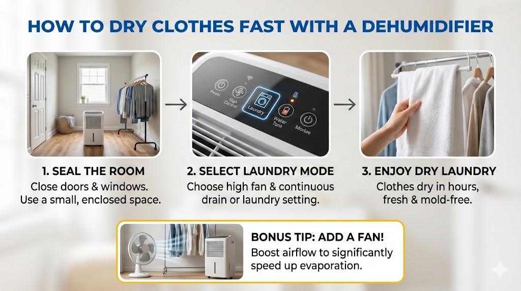 The key is something called the Vapor Pressure Deficit. Basically, moisture always wants to move from a wet area to a dry area. By using my dehumidifier, I’m keeping the air around the clothes extremely dry. This creates a “vacuum” effect for moisture. The water in the fabric has no choice but to jump into the air to balance things out.