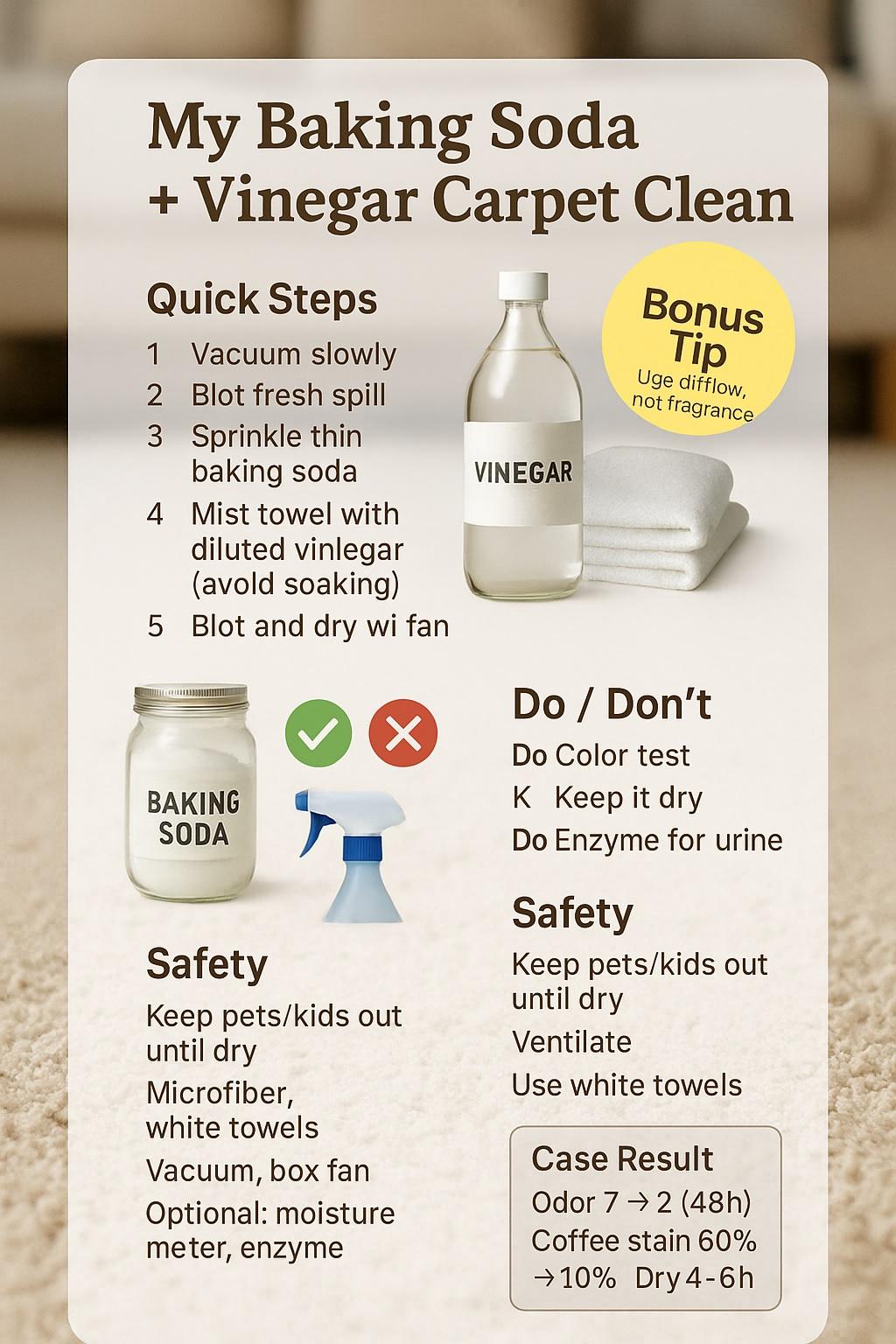 I wanted a quick, low-cost way to freshen rooms between deep cleans. I’ve got busy weeks, pets, and coffee habits. Baking soda took care of light odors; a touch of vinegar helped loosen some residue. I learned to be stingy with liquids and generous with drying time.