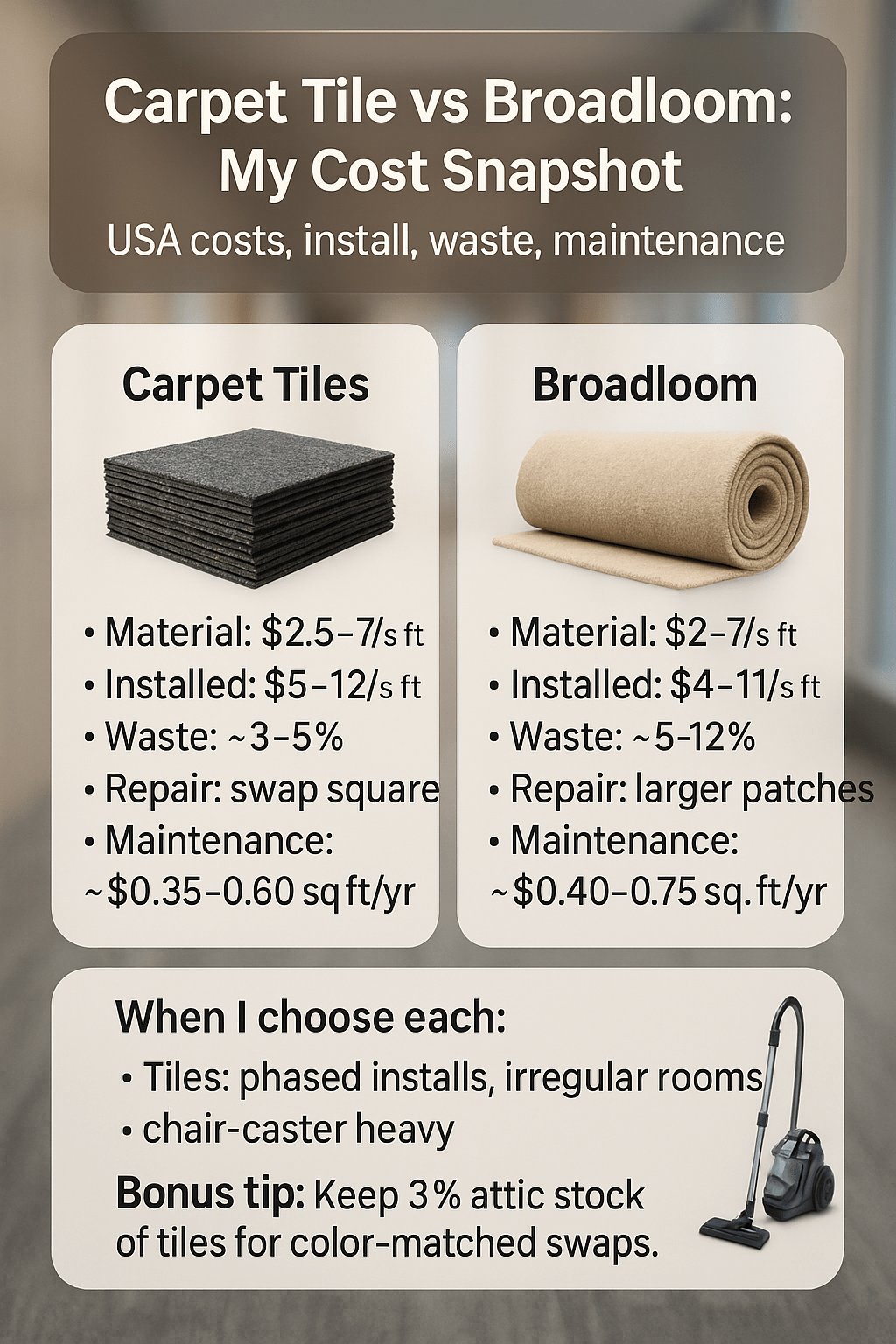 Compare carpet tile cost and broadloom carpet cost with clear U.S. ranges per sq ft, installation, waste, and maintenance. Expect tiles at $2.50–$7.00 material, broadloom $2.00–$7.00; installed $5–$12 vs $4–$11. Tiles cut downtime, allow spot replacement, and lower life-cycle risk.