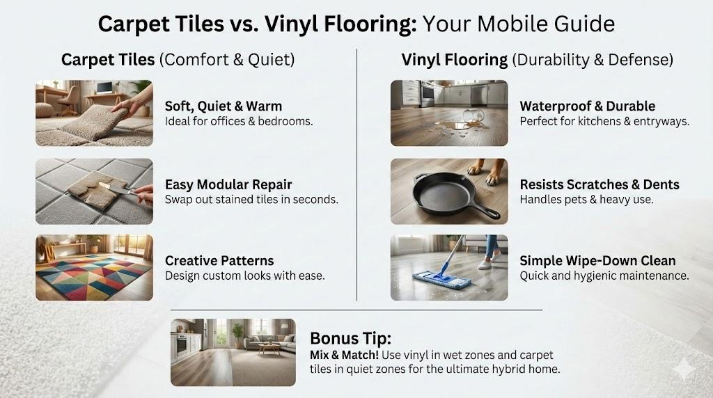 Choosing between carpet tiles and vinyl flooring depends on specific environmental needs. While luxury vinyl planks offer superior moisture resistance for kitchens, modular carpet tiles provide essential acoustic dampening in workspaces. Both options offer easy DIY installation and long-term durability for modern interior renovations.