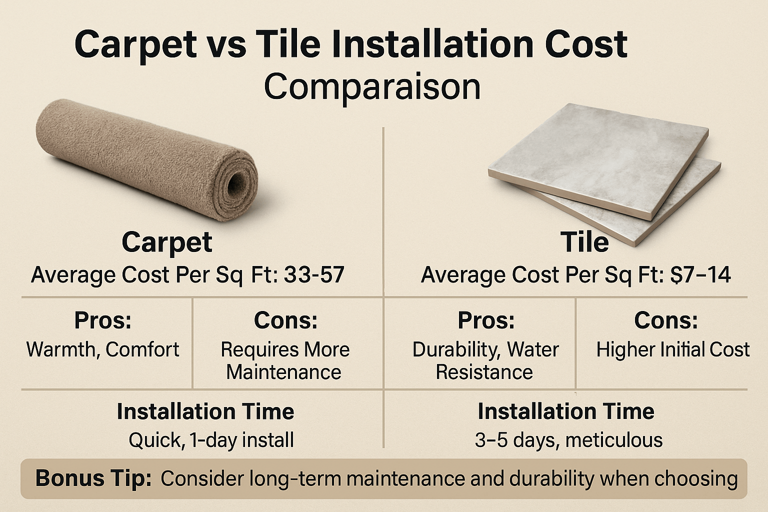 Carpet vs tile installation cost comparison: carpet costs $3-$7 per sq ft, while tile ranges $7-$14 per sq ft. Factors like material quality, installation complexity, and labor rates impact these costs. Carpet provides warmth but needs more maintenance; tile is durable and water-resistant.