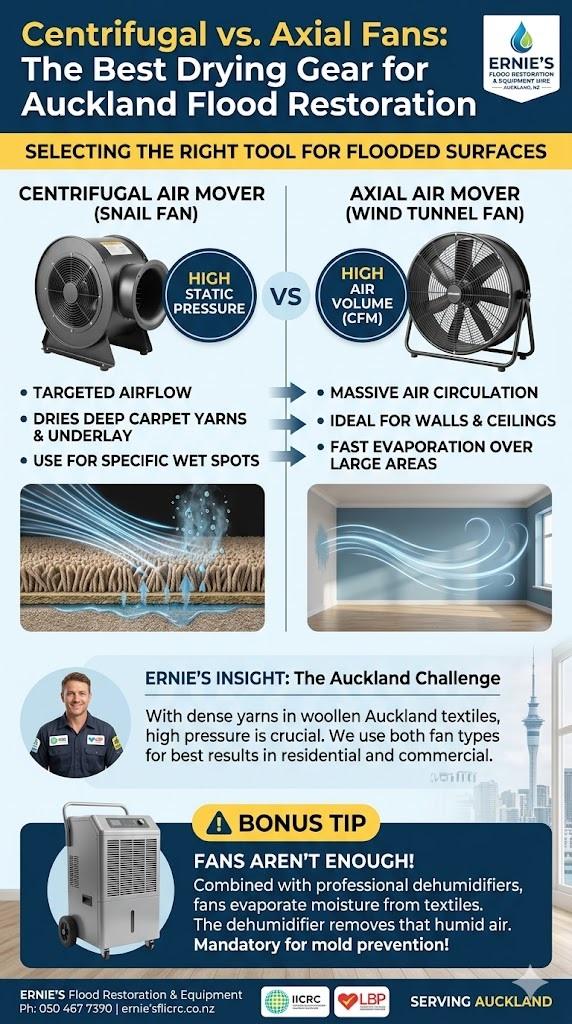 Choosing between centrifugal fans and axial air movers is critical for efficient flood restoration. Centrifugal models deliver high-pressure airflow ideal for drying damp carpet yarns, while axial fans provide high-volume circulation across large wall surfaces, significantly reducing overall structural drying times.