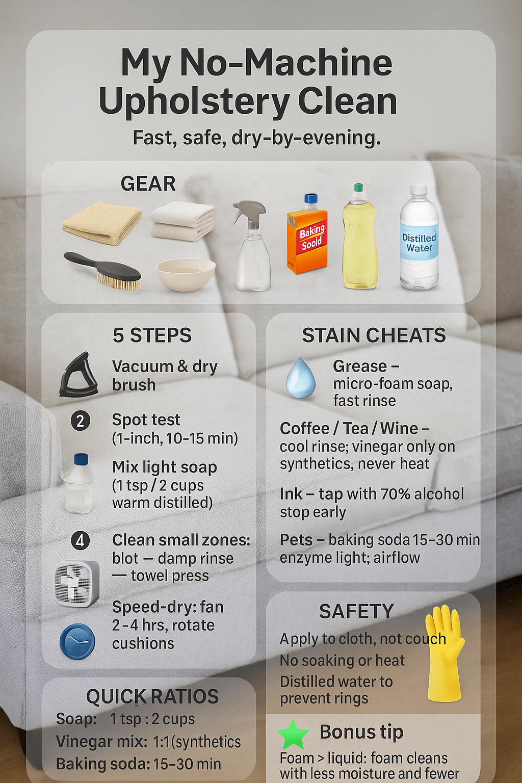 I stick to a simple flow that saves time and fabric: dry soil removal, spot test, mix one mild solution, clean small zones, blot-rinse with damp cloths, then speed-dry with a fan. I’ve tested this on kid spills, pet messes, and movie-night disasters without bleaching colors or raising fabric nap.