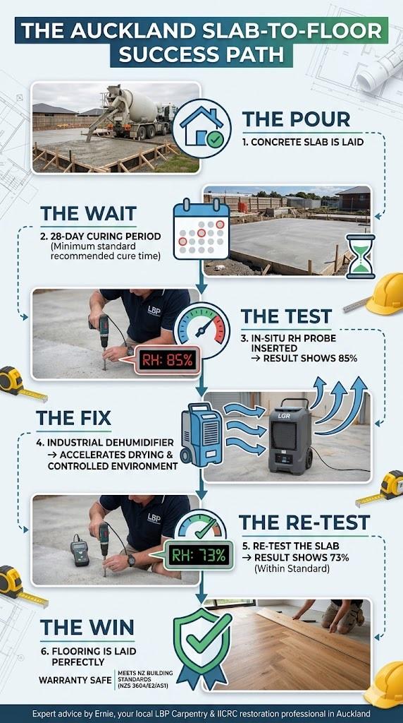 In my years as an LBP in Carpentry, the biggest mistake I see is “eyeballing” a slab. Concrete is like a giant sponge. Even if it looks bone-dry on top, there is often a massive reservoir of moisture deep inside the mix. This is especially true in humid Auckland suburbs like Mt Roskill or Epsom.