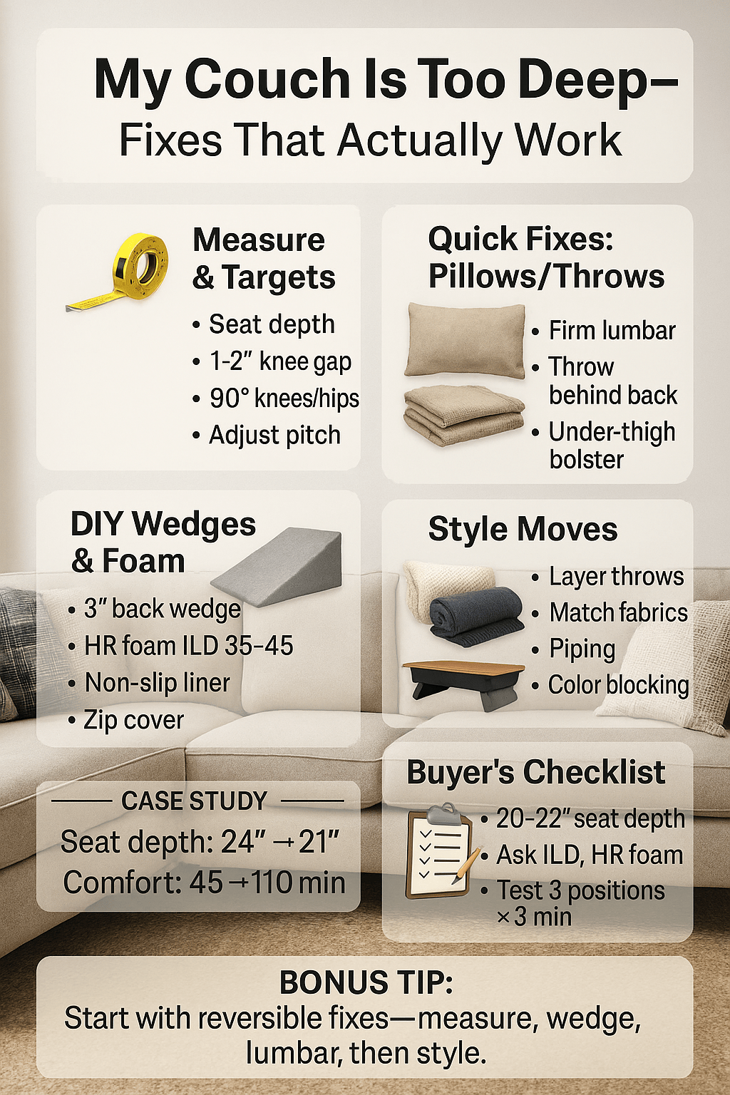 A comfy sofa swallowed me whole. This is the step-by-step plan I used to make a too-deep couch feel perfect without replacing it.