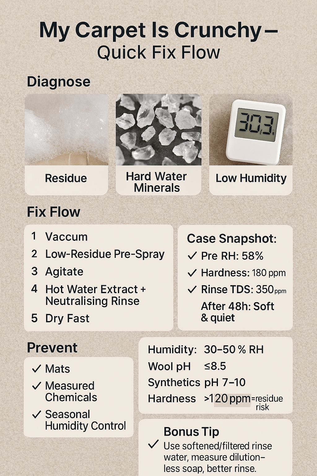 If your carpet is crunchy, residue, low humidity, or minerals may be the cause. Crunchy carpet often follows too much soap, weak rinsing, or hard water. Check stiff carpet fibers, room humidity near 30–50%, and fiber-safe pH after cleaning to restore softness, bounce, and quiet steps.