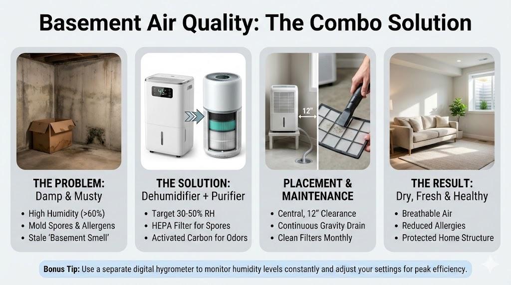 After years of trial and error, I’ve learned that a healthy basement isn’t a luxury; it’s a necessity. By combining a powerful dehumidifier with a high-quality HEPA air purifier, I’ve turned a dark, damp “dungeon” into a vibrant part of my home. It took some research and a few mistakes, but the result is a space I’m proud of.