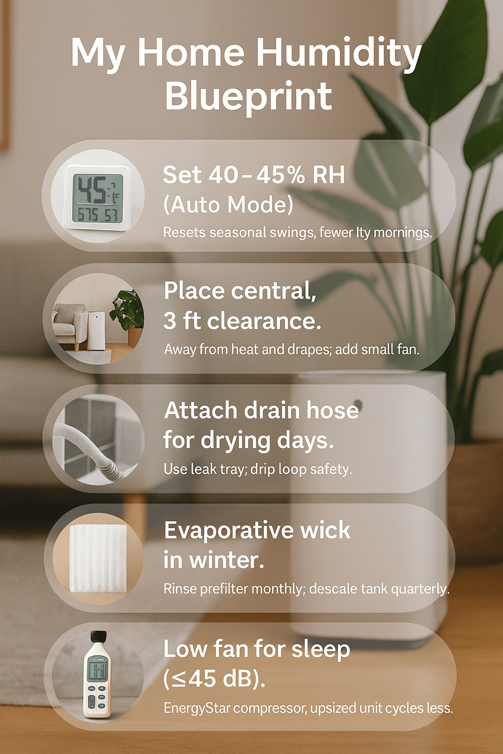 Regional weather matters, too. Friends in the Southeast dehumidify nine months a year. In the Southwest, humidification dominates. In the Midwest, it’s a ping-pong match between seasons. My combo unit makes those transitions invisible; I just keep 45% RH as my anchor.