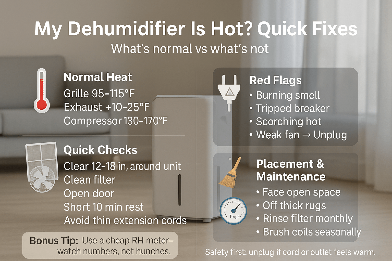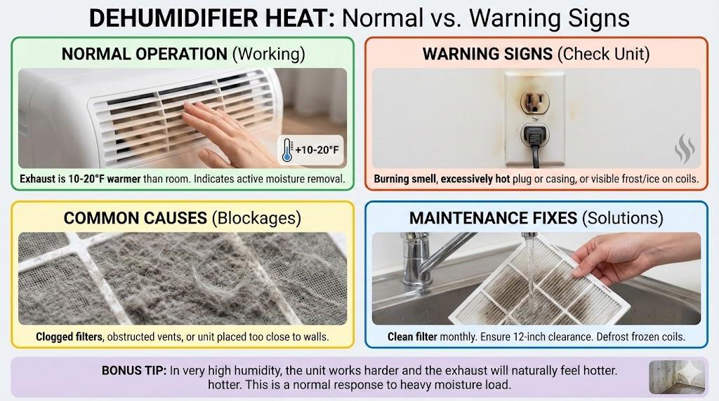 A dehumidifier is hot because it moves heat while drying air. Normal signs include warm exhaust, a warm grille, and a hot compressor. Typical ranges: surface 95–115°F, exhaust +10–25°F, compressor 130–170°F, and indoor RH 45–50%. Watch safe operating temperature and overheating dehumidifier symptoms closely.