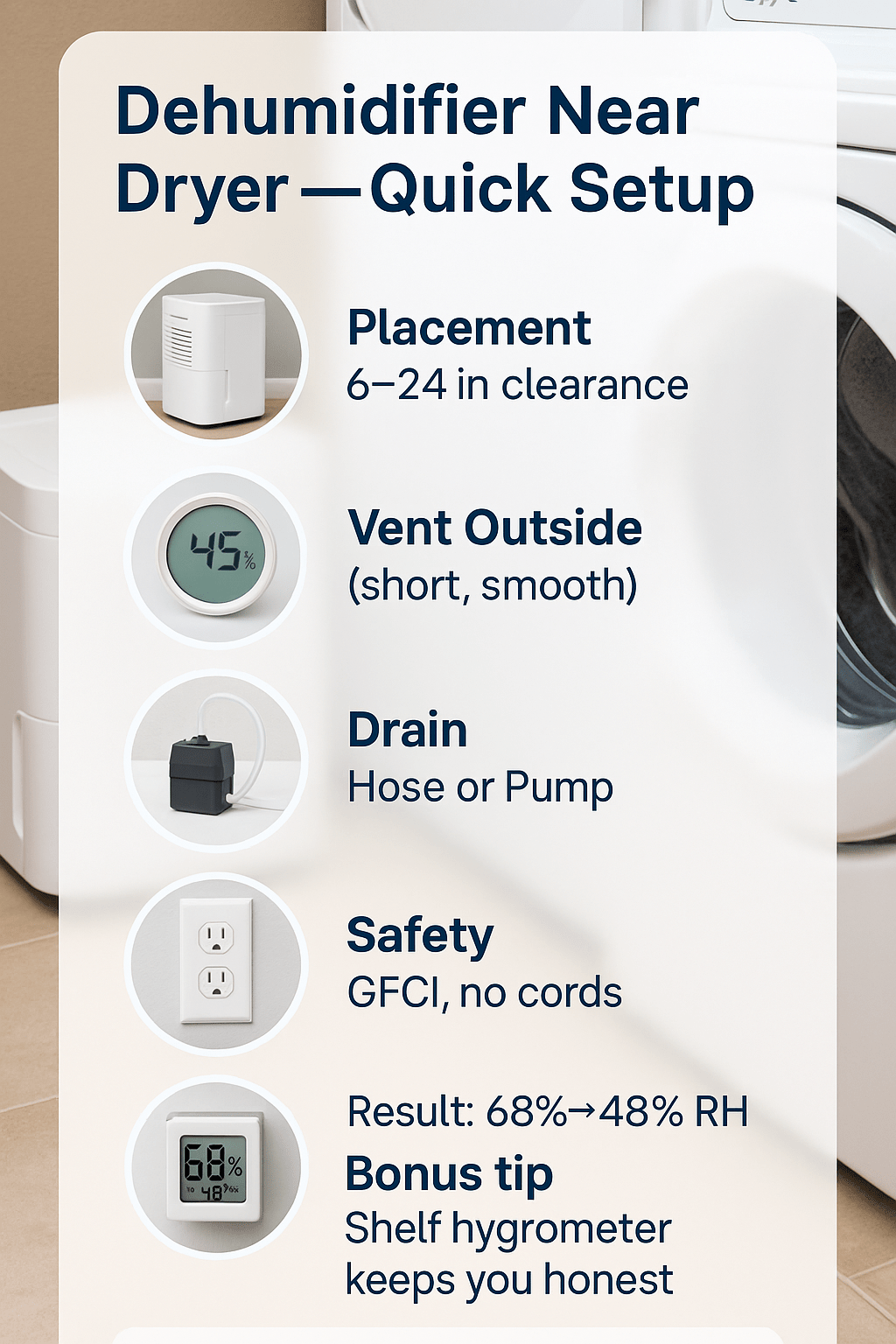 Placing a dehumidifier near dryer slows moisture spikes, improves laundry room humidity control, and cuts mildew smells. Target 30–50% RH, keep dryer venting clear to the outdoors, and leave airflow space around both units. Use GFCI outlets, avoid extension cords, and drain collected water safely.