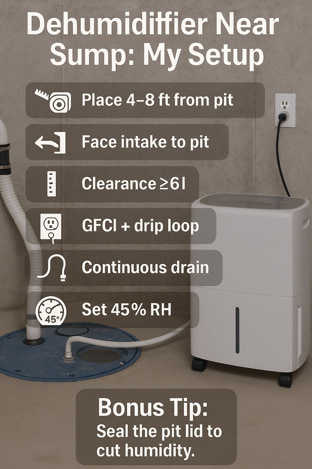 The wettest air in my basement hovered right around the pit, especially after storms. Putting my dehumidifier “near but not on top of” the sump cut the moisture where it starts. I saw faster drops in RH, fewer odors, and shorter runtimes compared with parking it across the room.