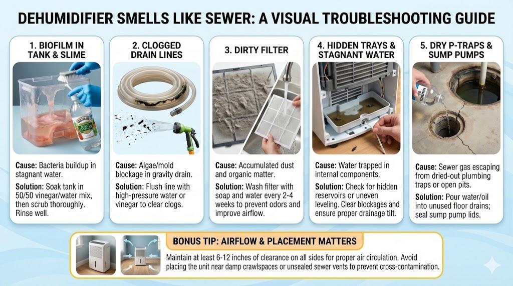 Dehumidifier smells like sewer? Common culprits are biofilm in the tank, a dry floor-drain P-trap, or a contaminated drain hose. Keep indoor RH at 30–50%, flush drains weekly, and sanitize the reservoir to stop dehumidifier smells like sewer, sewer gas, and mold growth.