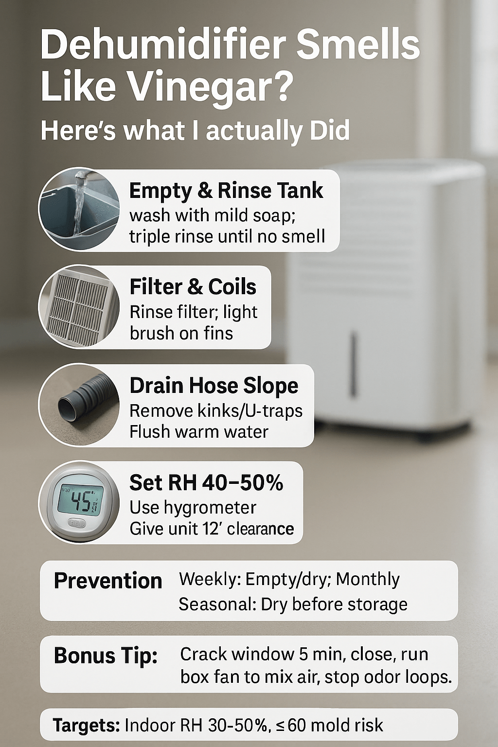 Set realistic humidity (around 45%), give the unit space, and clean with mild soap first. Use vinegar only as a quick rinse and flush it completely. Keep the hose sloped, the filter clear, and the bucket bone dry before storage. Most “vinegar” problems vanish when water can’t linger.