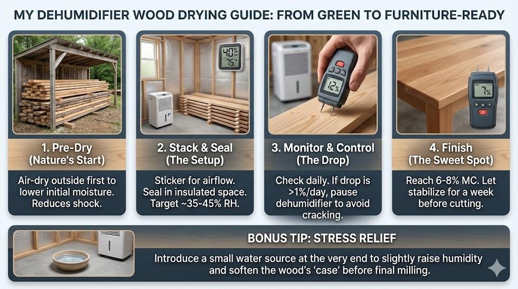 I discovered that a dehumidifier acts like a time machine for lumber. Instead of waiting for the seasons to change, I create the exact conditions I need to pull moisture out of the wood fibers safely. It’s about controlling the “evaporation rate” so the outside of the board doesn’t dry faster than the inside.