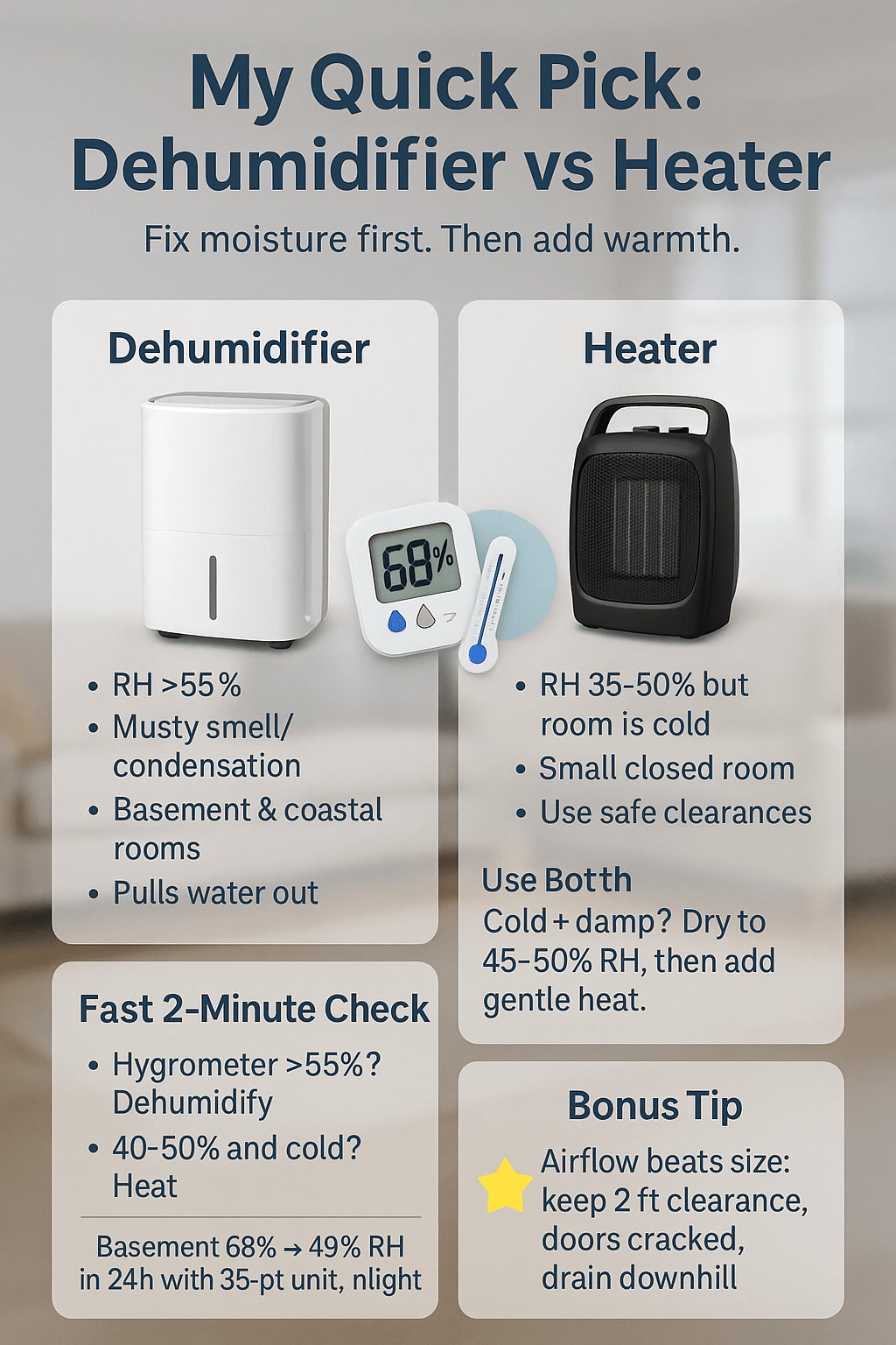 My Real-World Guide: Dehumidifier vs Heater (How I Decide Fast)