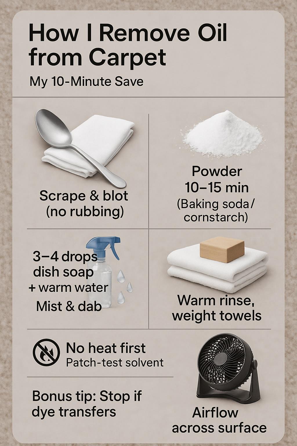 I learned the hard way that oil on carpet doesn’t forgive slow reactions. Here’s exactly how I fix it fast at home and on jobs—simple, safe, and it works.