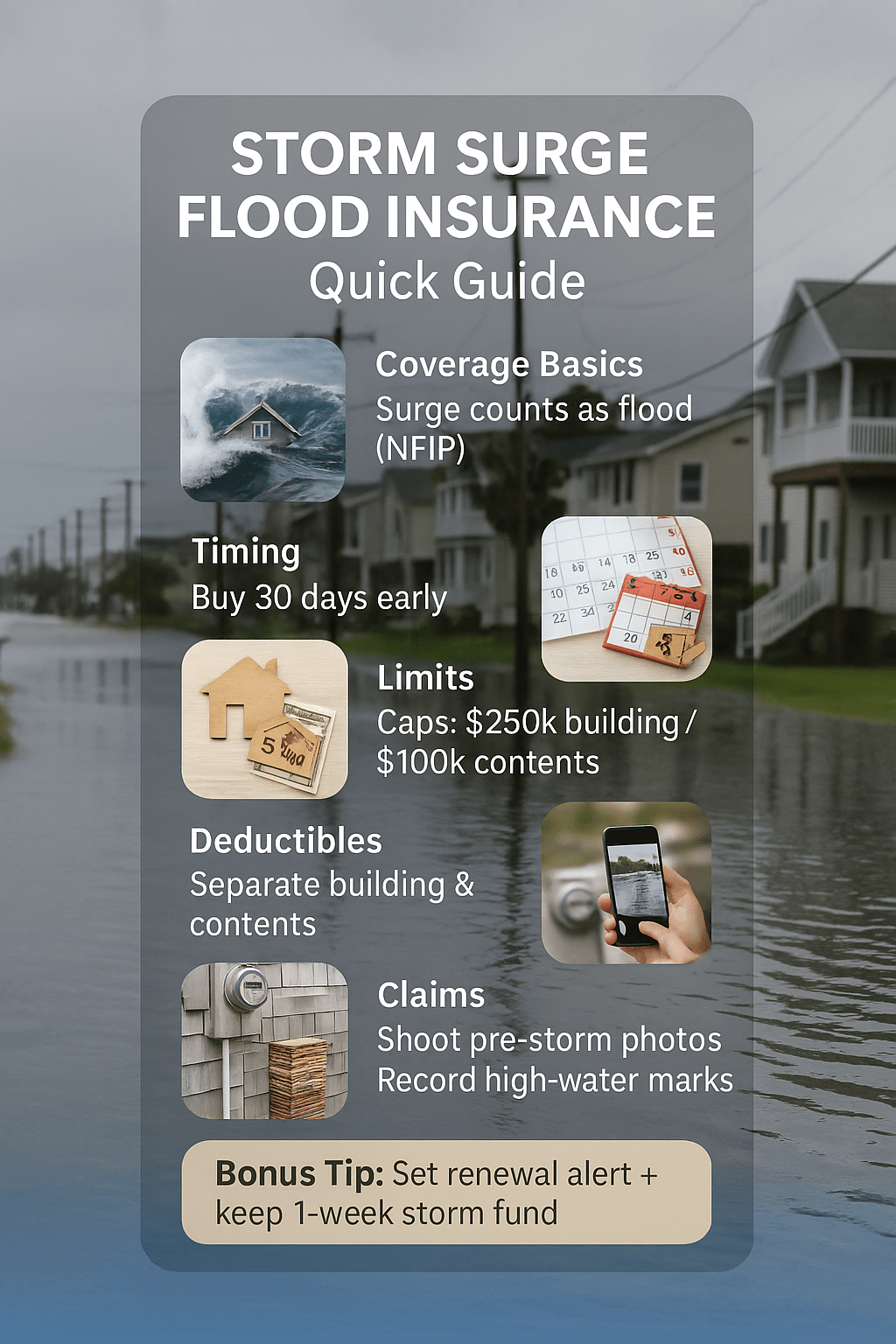 Storm surge flood insurance is typically covered under NFIP policy rules as overflow of tidal waters, separate from homeowners insurance. Wind-driven rain is different from flood. Waiting periods usually apply, limits cap out quickly, and private flood can fill gaps depending on risk and budget.