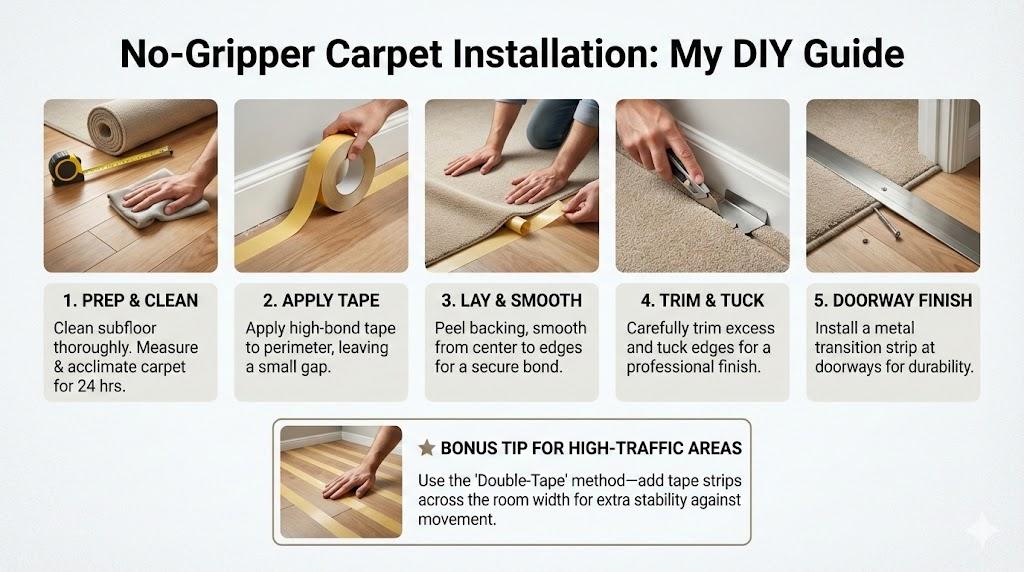 I didn’t just wing it; I actually spoke to some old-school carpet fitters to see why they hate the “no-gripper” method. Most of them told me that without grippers, the carpet will eventually stretch and “bag.” They aren’t wrong, but their perspective is based on heavy action-back carpets.