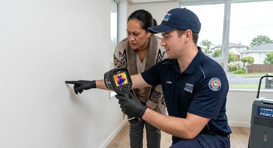 Drying the carpet is only the beginning. In Auckland homes—especially older timber-framed properties—water tracks further than the naked eye can see.