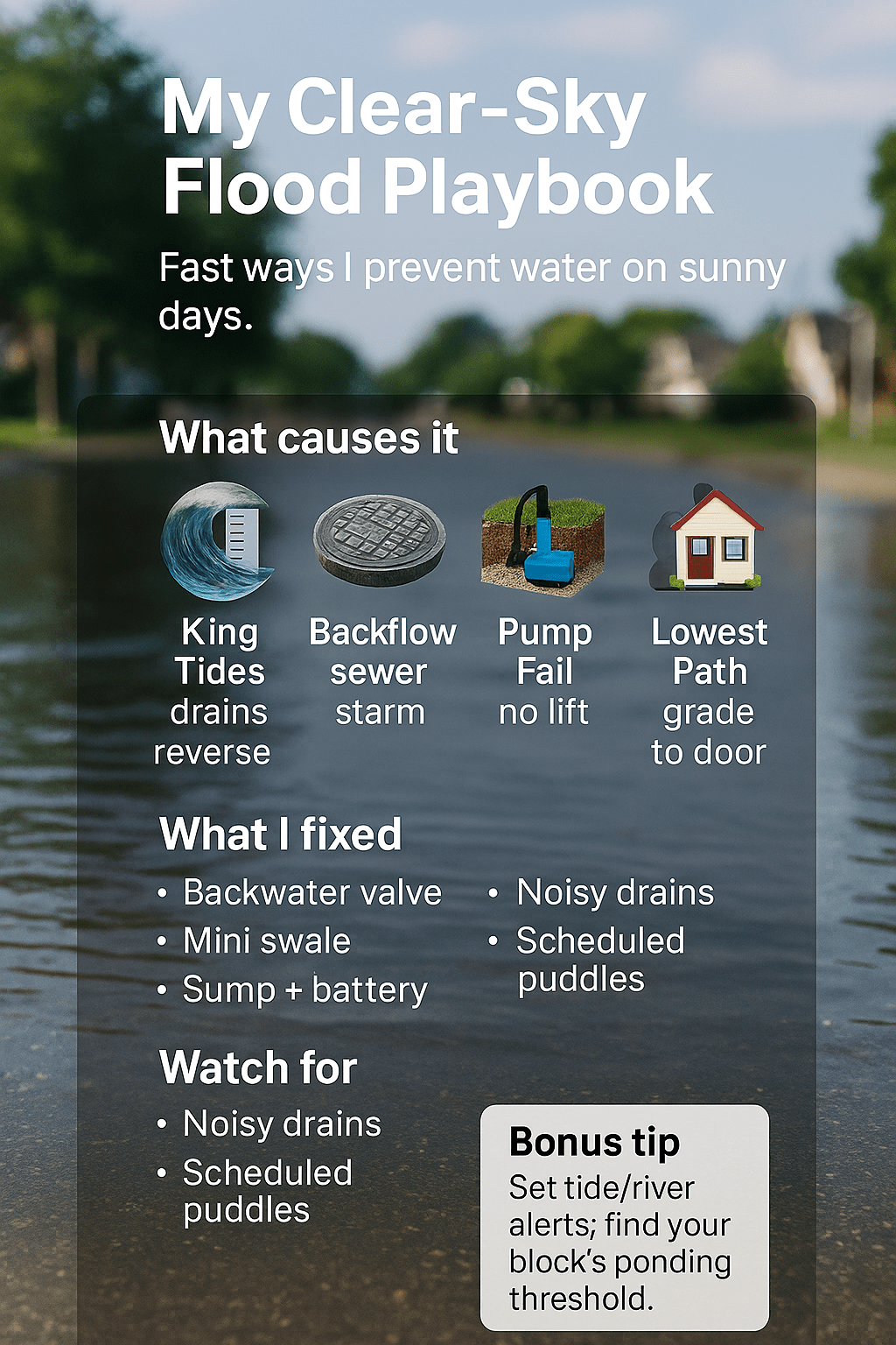 Floods can arrive without clouds from flood without rain triggers like sunny-day flooding, high-tide flooding, sewer backflow, or groundwater rise. Learn the mechanics, the warning signs you can spot on a walk, and the fixes that kept my floors dry the next time the sky was clear.