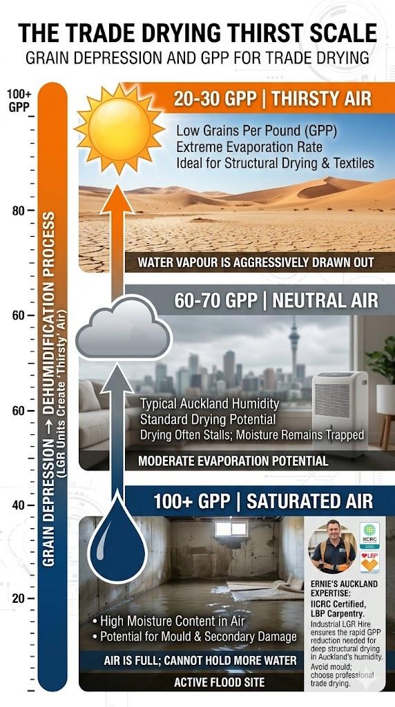 Auckland is notoriously humid. On a rainy day in Epsom or One Tree Hill, the outside GPP is often too high to allow for natural drying. If you just use fans, you are simply moving wet air over wet materials. This can actually lead to secondary damage like mould.