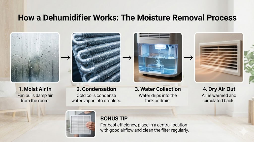 A dehumidifier works by drawing moist air through an inlet, passing it over refrigerated cooling coils to condense water vapor into liquid droplets. This dry air is then reheated and circulated back into the room, effectively reducing relative humidity levels to prevent mold growth and improve air quality.