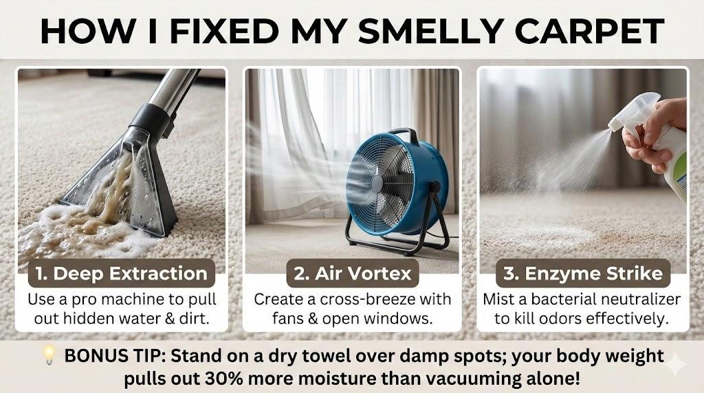 If your carpet smells, don’t just spray more perfume on it. Get the air moving, pull out the excess water, and use an enzyme cleaner. Most smelly carpets can be saved if you act within the first 48 hours. My home is now a sanctuary again, and I never fear the “wet dog” smell.