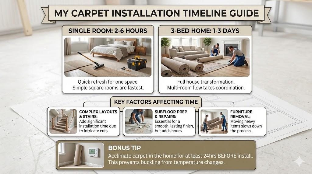 Professional carpet installation duration typically ranges from 2 to 6 hours for a single standard-sized room. For a full three-bedroom residential home, the expert process usually takes one to three days. Factors like furniture removal, subfloor prep, and room layout directly impact the overall project timeline.