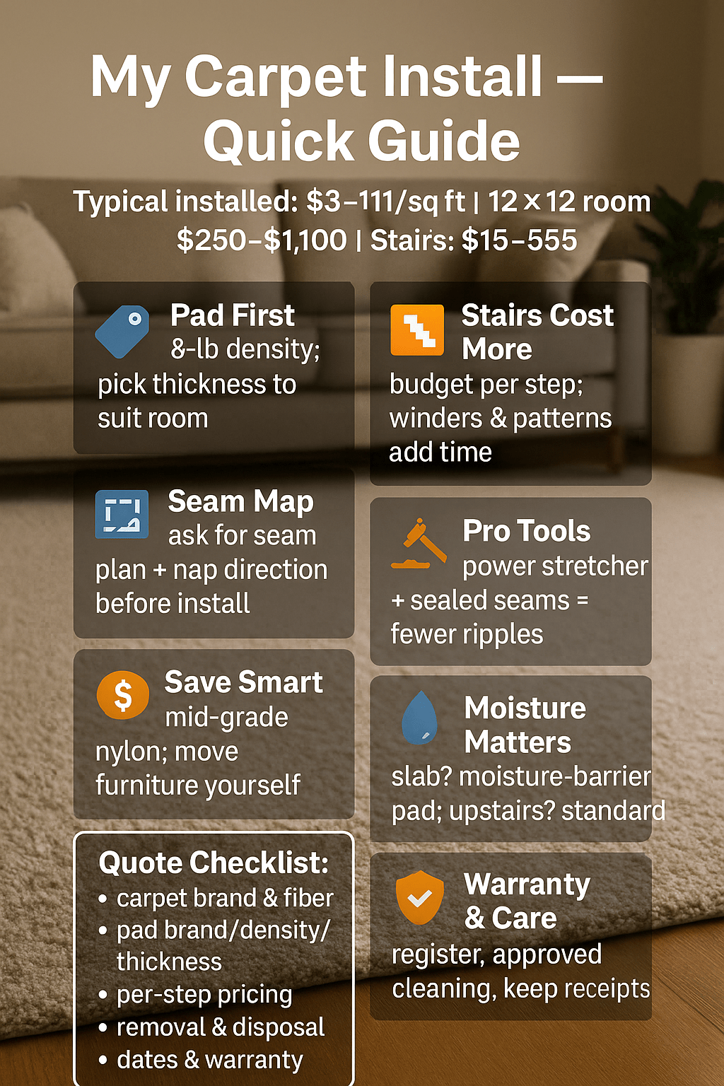 First, specify pad by brand, density, and thickness. Second, demand a seam map for patterns and long runs. Third, price stairs as a standalone line. Those three habits turned my “mystery quote” into a predictable plan—and kept the finished rooms looking sharp.