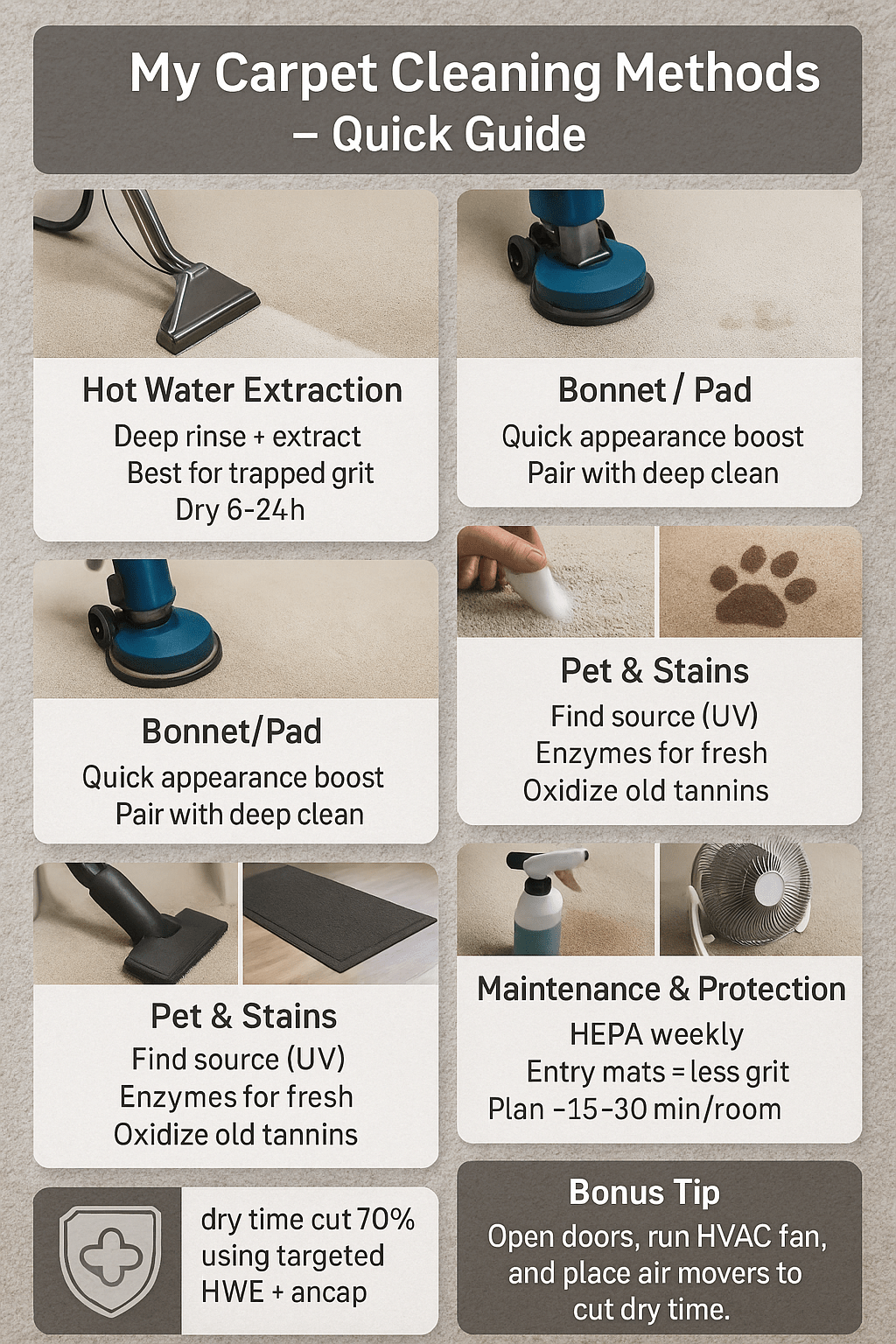Compare carpet cleaning methods fast: hot water extraction removes deep soil but needs 6–24 hours to dry. Low-moisture encapsulation dries in 1–2 hours. Bonnet targets traffic lanes; dry compound uses minimal water. Water use ranges ~1–10 gallons per room; results depend on fiber and stains.