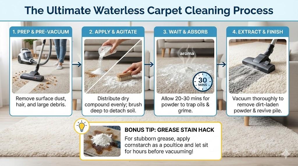Dry carpet cleaning removes embedded soil using mechanical action, absorbent compounds, and filtration; it helps prevent over-wetting, wick-back stains, and mold risk. Learn how to clean carpet without water, pro-grade dry carpet cleaning steps, and ideal no-water carpet care settings—fast, safe, effective.
