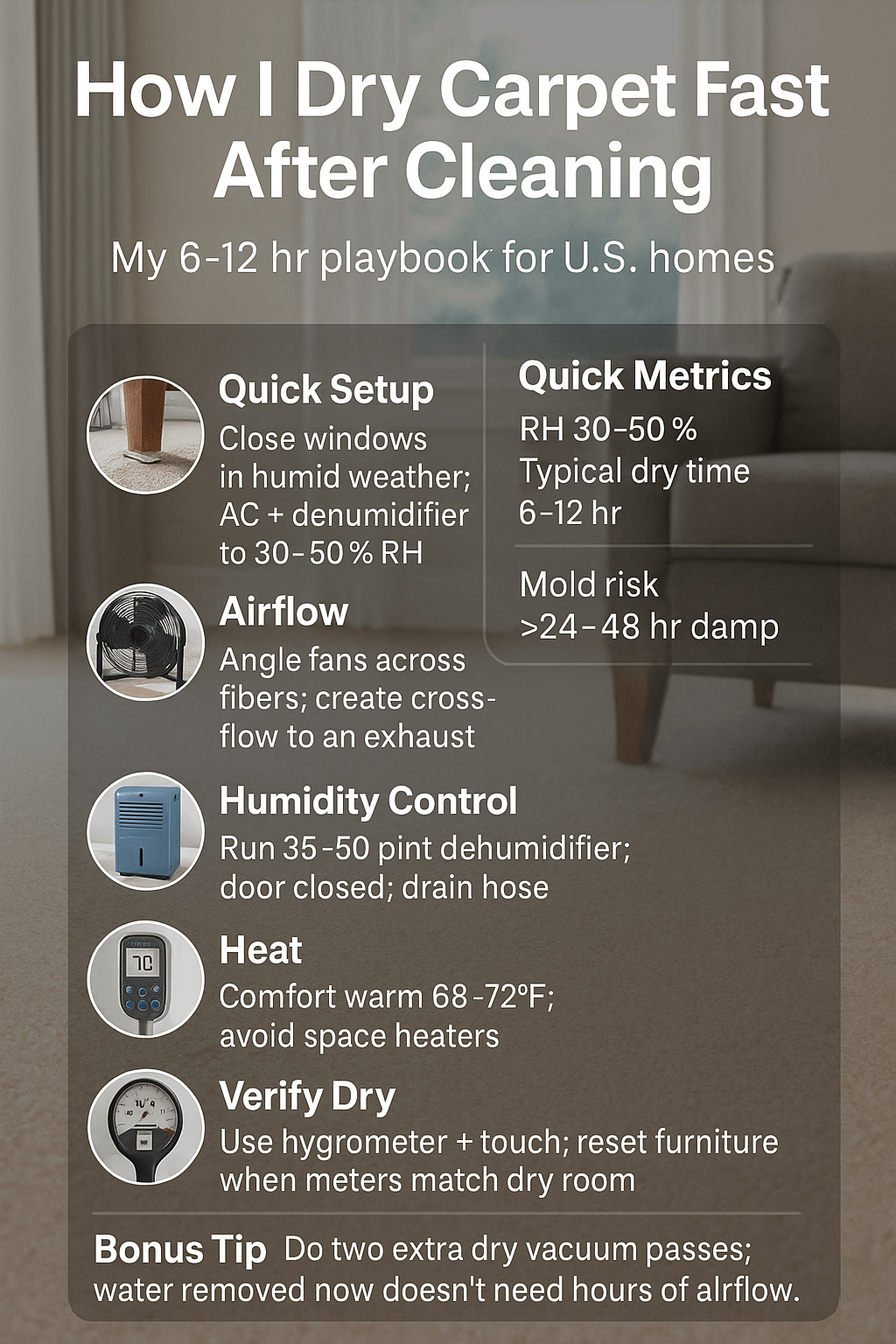 Learn how to dry carpet after cleaning using airflow, dehumidifiers, and 30–50% RH. Typical carpet drying time is 6–12 hours; dry within 24–48 hours to prevent mold. Boost extraction, create cross-flow, monitor with a hygrometer, and wait until fibers feel cool-to-touch.