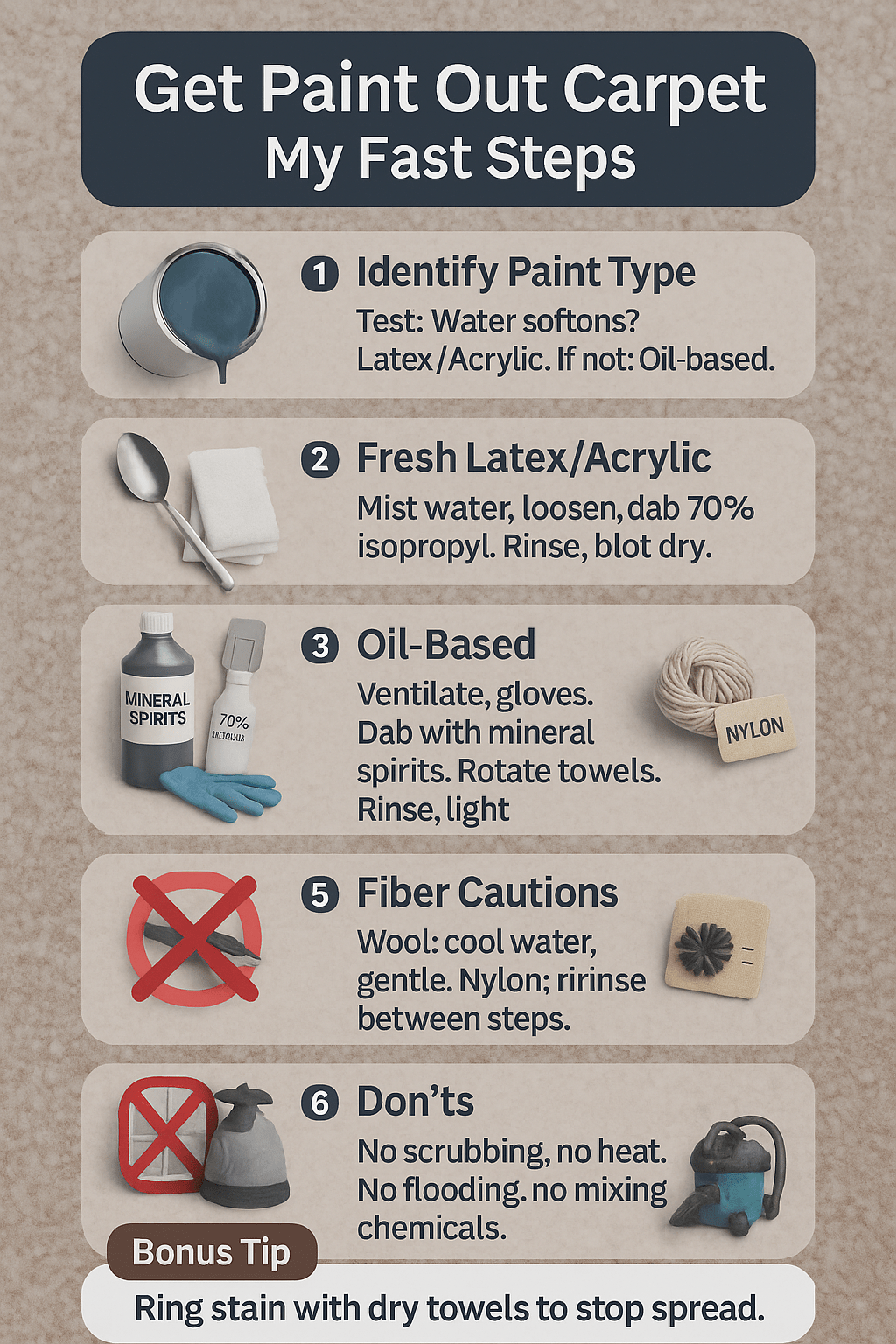 how to get paint out of carpet fast: blot, never rub; confirm paint type; use mild soap for water-based, targeted solvent for oil-based; work from edges inward; rinse and dry to stop wicking. This also covers remove dried paint safely and oil-based vs water-based solutions.