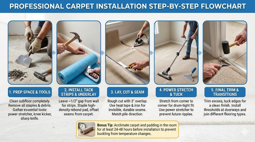 Installing new carpet involves preparing a clean subfloor, installing tack strips, and laying down high-quality underlay. Professionals then stretch the carpet across the room using a power stretcher to prevent future wrinkles, ensuring seamless joins with heat tape and a flawless finish at the edges.