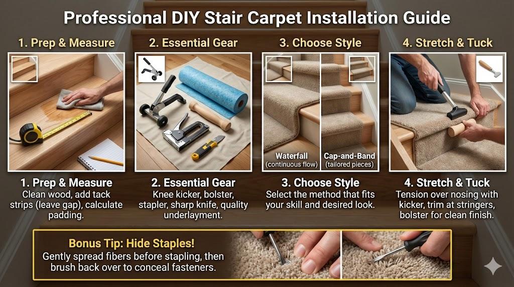 nstalling carpet on stairs is a challenging yet rewarding home improvement project that enhances safety and comfort. To achieve a professional finish, you must focus on precise measurement techniques, the use of high-quality tack strips, and selecting a durable carpet grade designed for high-traffic areas.