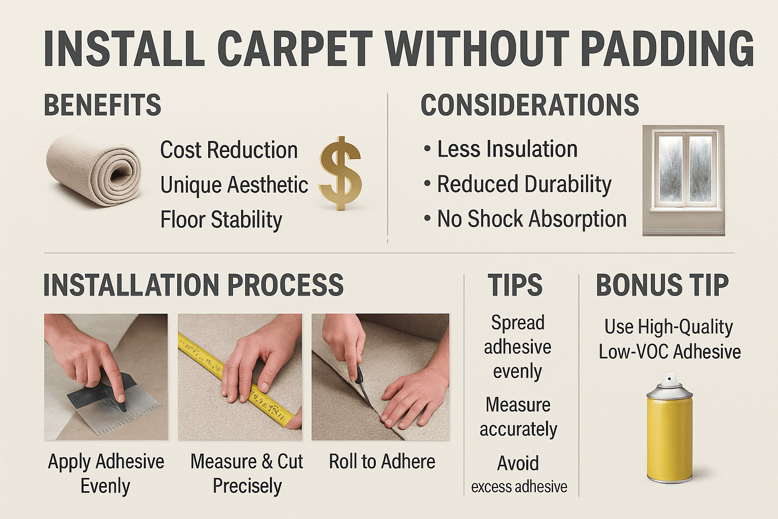 - John Doe, Flooring Expert, National Flooring Association: “Installing carpet without padding can save on costs but may impact insulation and comfort.”