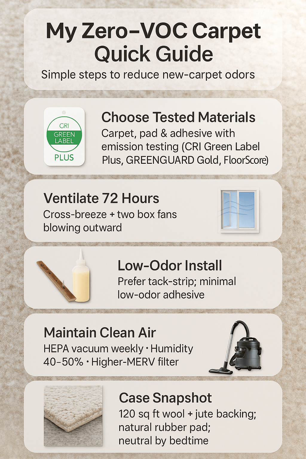 A client asked for a low-odor bedroom refresh before hosting out-of-town family. We targeted a gentle fiber, a documented cushion, and a low-odor adhesive only where necessary. Weather was mild, so we scheduled a morning install and aired the room all afternoon with two box fans.