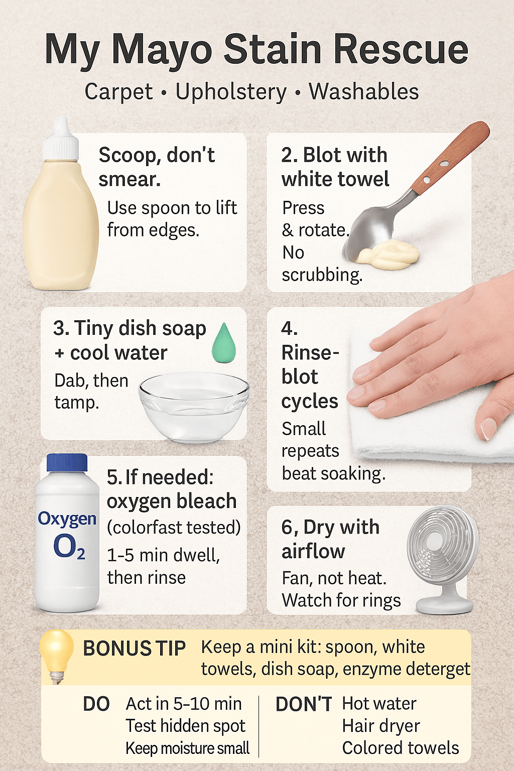 I didn’t beat mayonnaise with some magic potion. I beat it with order, patience, and tiny moves at the right time. Keep your mini kit close, breathe, and follow the sequence. Most mayo stains can be fixed without drama—and without a new rug or a new couch.