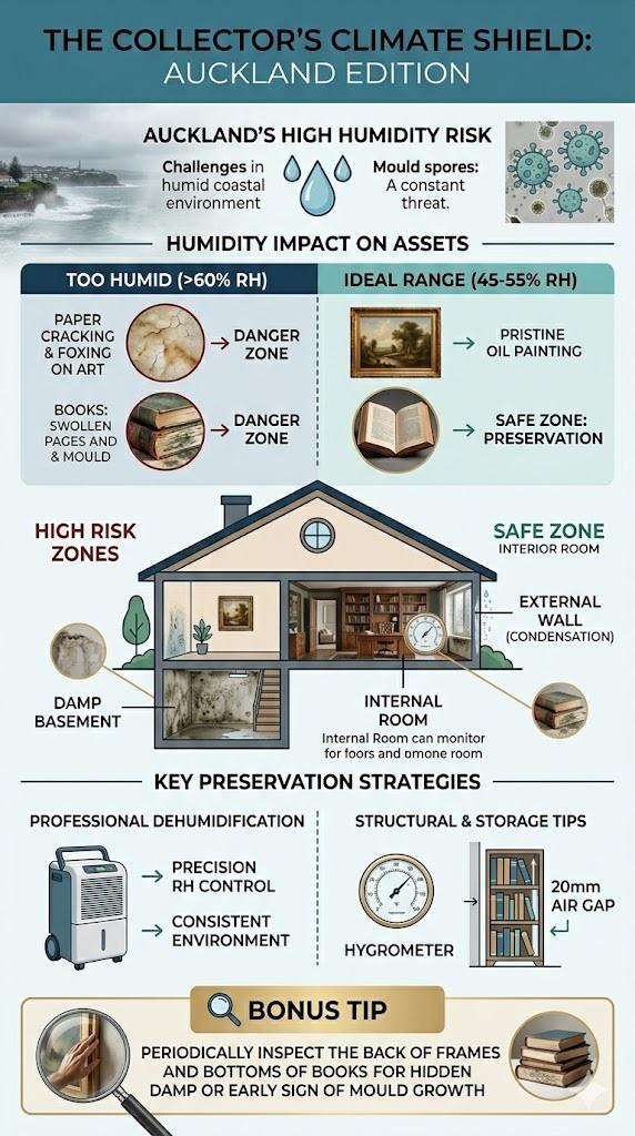 Auckland often sits at 80% humidity. At these levels, “foxing”—those nasty brown spots on paper—becomes inevitable. I remember visiting a client in Remuera who had an incredible basement library. Because the air was stagnant and damp, the threads in the book bindings were literally rotting away.