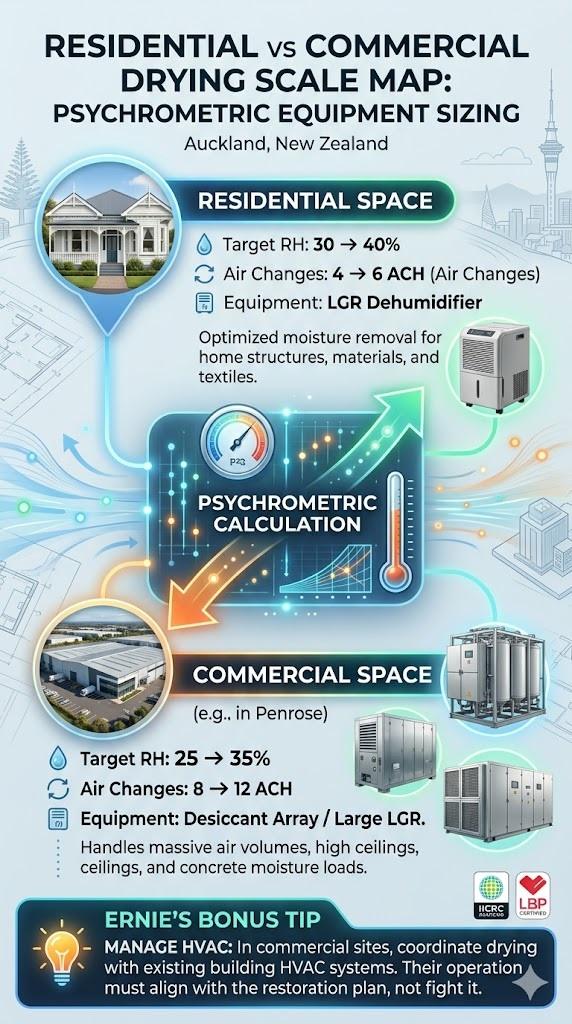 Psychrometric charting calculates moisture removal by measuring relative humidity and temperature. Proper equipment sizing involves determining the specific humidity (GPP) to select dehumidifiers that outperform Auckland’s ambient conditions, ensuring structural drying occurs without secondary damage to building materials or textiles.