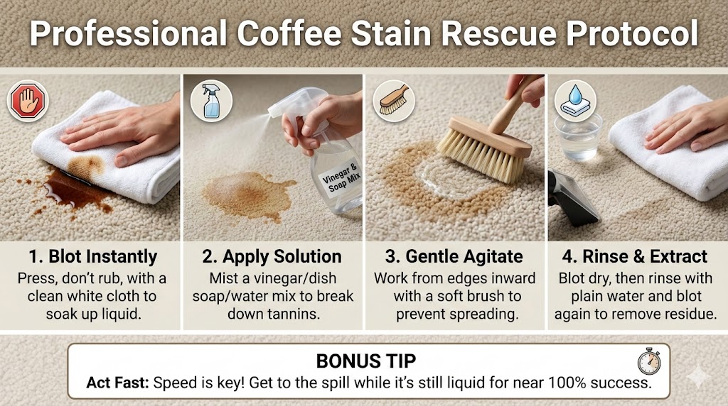 I remember the morning like it was yesterday. I had just finished installing a beautiful, cream-colored Berber carpet in my home office. I was feeling quite proud of myself, walking in with a steaming, overfilled mug of dark roast. One tripped shoelace later, my pristine floor looked like a Dalmation’s back. I panicked and did the worst thing possible: I scrubbed.