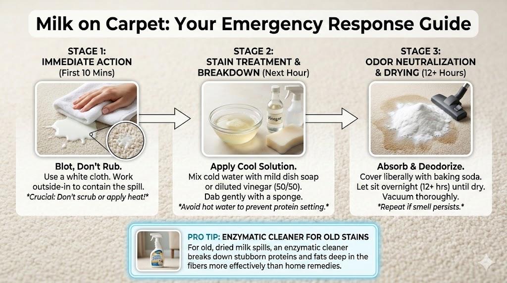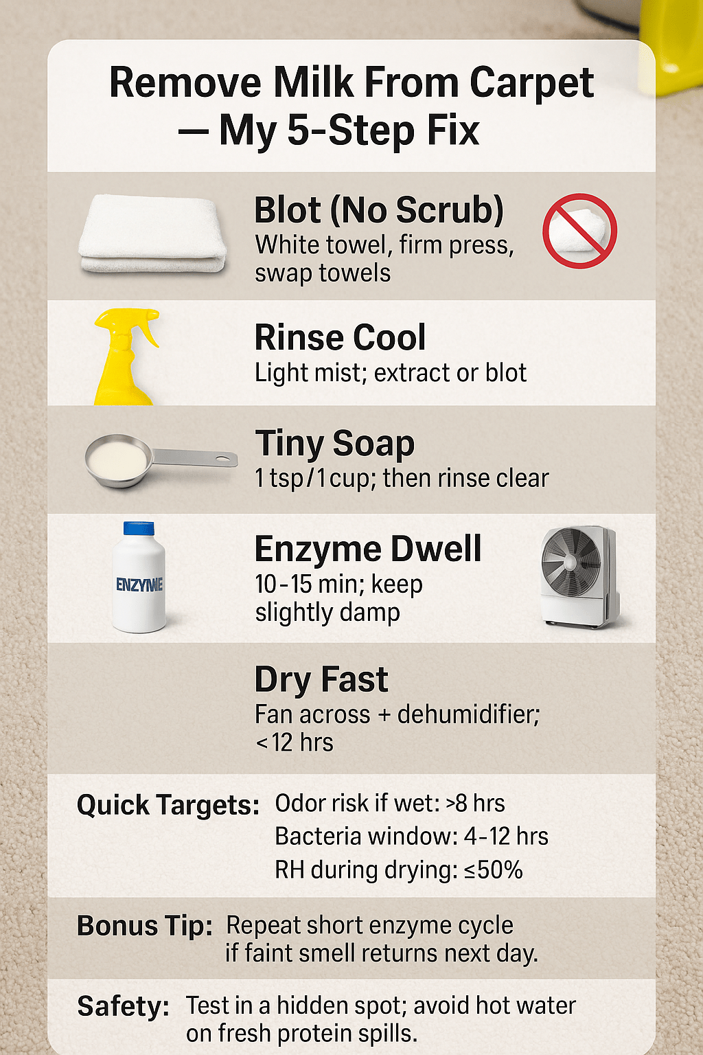 Spilled milk on carpet? Act fast: blot gently, rinse with cool water, apply enzyme cleaner, and dry within 12 hours. This guide covers safe ratios, timing, and tools for fresh or dried spills on common U.S. carpets, reducing odor, residue, and re-soiling risks.