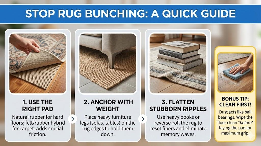 To stop a rug bunching up, ensure the floor is clean before installing a non-slip rug pad. Using furniture as anchors prevents shifting on high-traffic surfaces. These methods eliminate dangerous tripping hazards while preserving the structural integrity of your rug and the underlying flooring material.